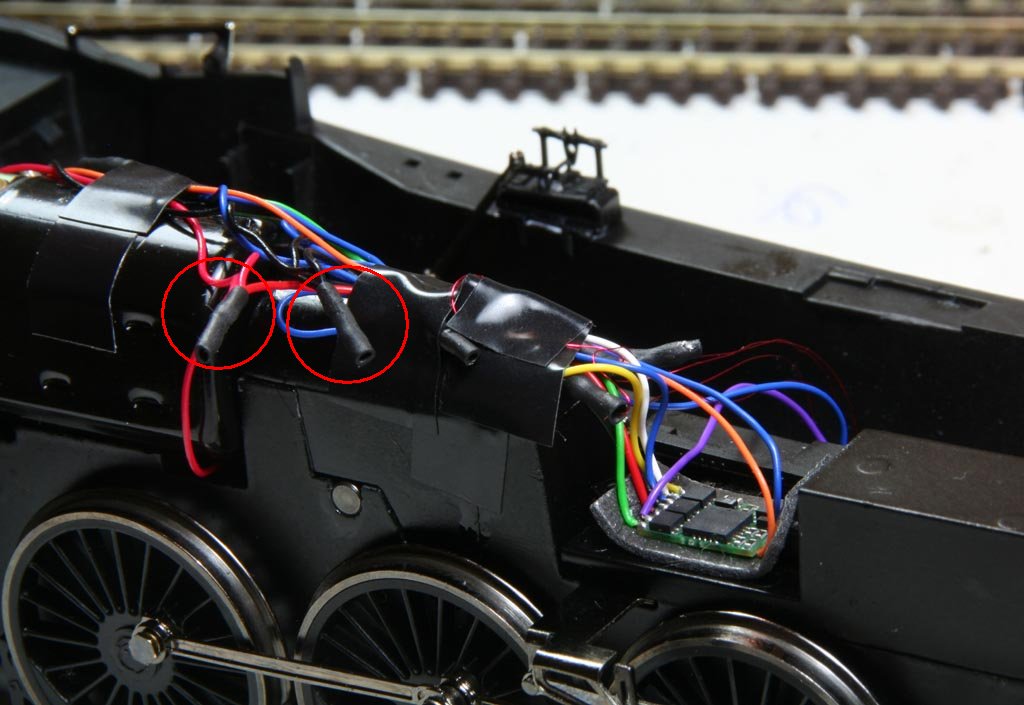 Decoder's RED and BLACK (pickup) wires connected to loco's pickups...